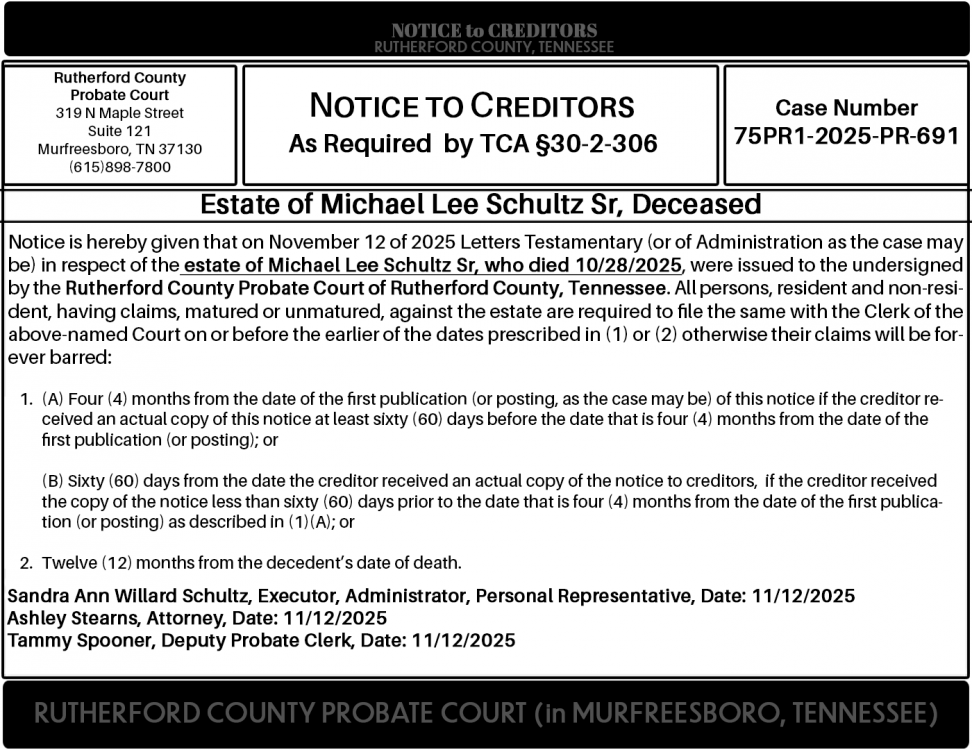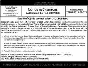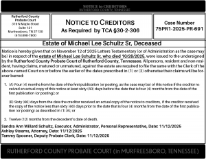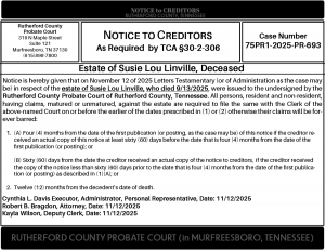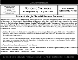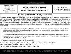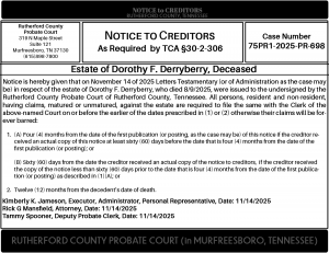 Rutherford County Probate Court319 N Maple Street, Suite 121Murfreesboro, TN 37130(615)898-7800 NOTICE TO CREDITORSAs Required by TCA §30-2-306 Case Number.... Read More