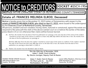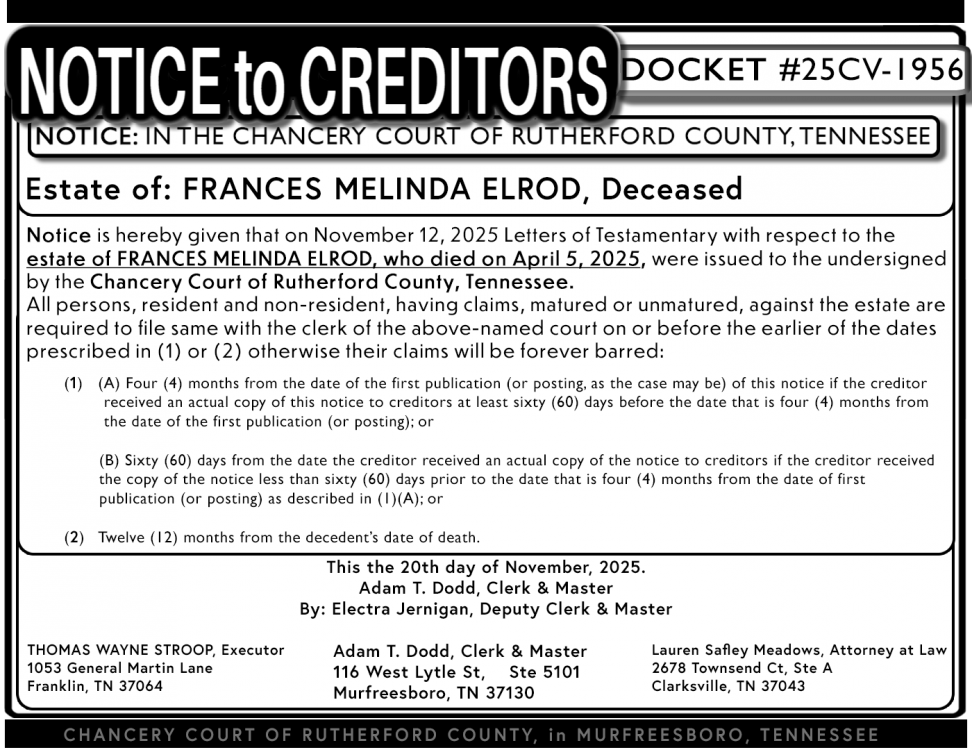 NOTICE TO CREDITORS Docket #25CV-1956Estate of: FRANCES MELINDA ELROD, Deceased Notice is hereby given that on November 12, 2025 Letters of Testamentary with respect to th.... Read More