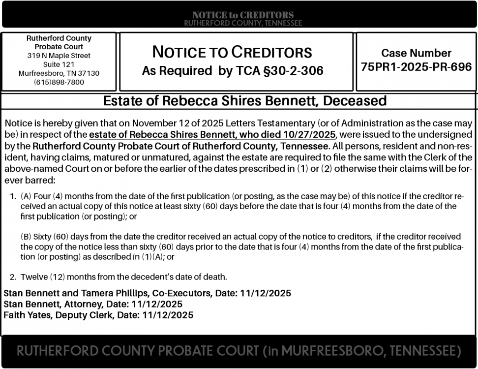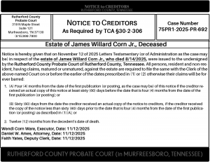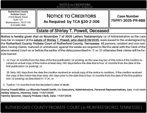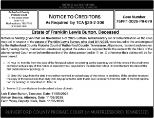 Rutherford County Probate Court319 N Maple Street, Suite 121Murfreesboro, TN 37130(615) 898-7800 NOTICE TO CREDITORSAs Required by TCA §30-2-306 Case Number: 75PR1-20.... Read More