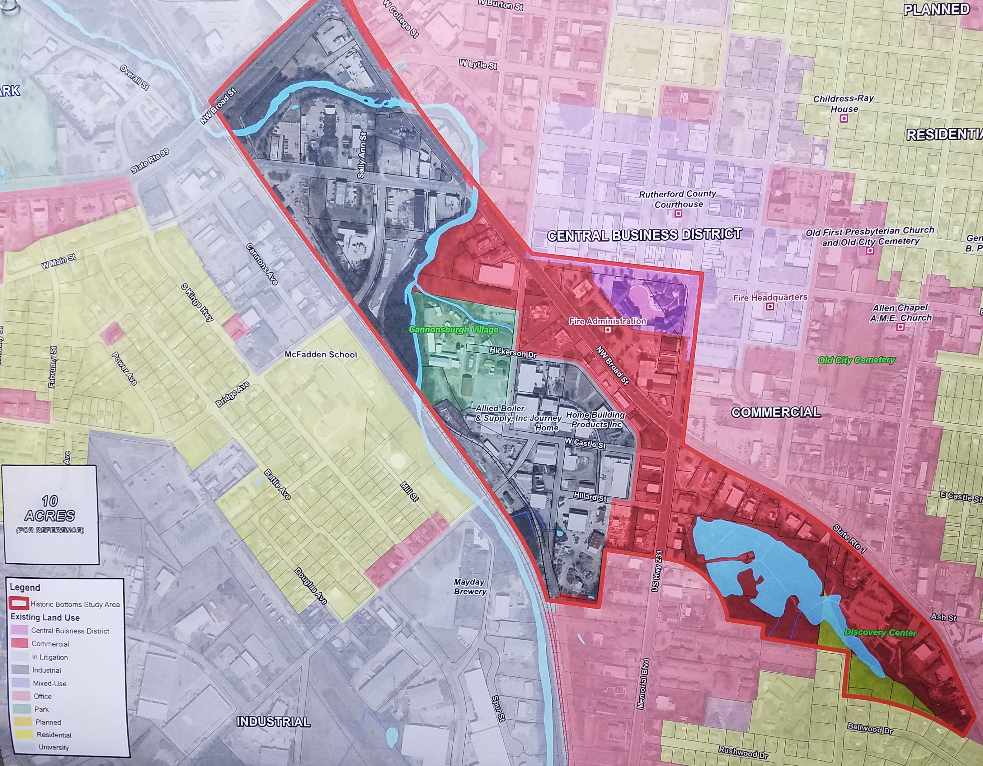 The Historic Bottoms study area is historically known as "The Bottoms" because of its low terrain and frequent flooding and includes the area of downtown Murfreesboro that is south of the historic Downtown Square, east along Southeast Broad Street to Discovery Center, and west along Southeast Broad Street to Memorial Boulevard to the CSX Railroad as the western boundary. The study area includes Murfreesboro's Civic Plaza, Cannonsburgh Village and the West Main Street area, to name a few key landmarks.