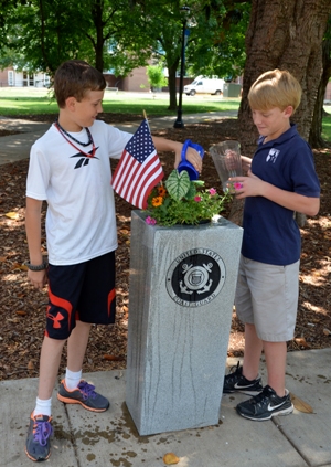 Central Magnet School student Will Stallings and St. Rose of Lima student Sebastian Matlock get the Veteran's Monument at MTSU ready for visitors over the Memorial Day weekend. The two 11-year old youth are watering the flowers in the area in preparation for special activities on campus.