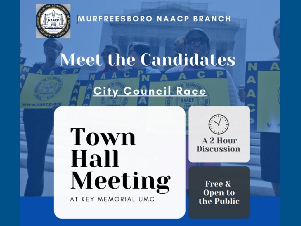 Sun. (June 26, 2022) 4-6PM Murfreesboro NAACP invites the public to learn about candidates who are seeking Murfreesboro City Council positions. This Town Hall meeting will be at Key United Methodist Church (806 E. State Street). This is FREE and open to the public and again, it focuses on candidates for the Murfreesboro City Council. (NOTICE: The next election is August 4, 2022 and Early Voting is July 15-30, 2022)