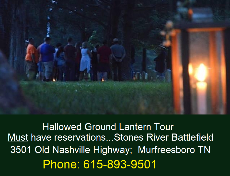 Sat. (Sept. 9, 2023) 6:45-7:45PM HALLOWED GROUND LANTERN TOUR led by a park ranger at the Stones River National Battlefield (3501 Old Nashville Highway; Murfreesboro). This hour-long walk by lantern light gives visitors a chance to appreciate the human stories through letters sent home from the soldiers buried here. It is free and NO WALK-IN allowed...reservations are required. Cancellations must be made by calling 615-893-9501 by 10 AM on the day of the program. Reservations are not transferable. This program is not recommended for children under 10 years of age nor is it accessible for strollers or wheelchairs. Pets are not permitted.
