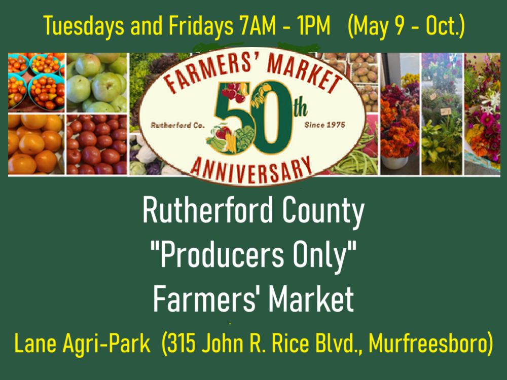 Fri (May 9 – Oct. 31, 2025) 7:00AM – 1:00PM This entire season will be a 50th Anniversary celebration for Rutherford County FARMERS' MARKET. This producer-only Farmers Market is located in the indoor/open-air Community Center at the Lane Agri-Park (315 John R. Rice Blvd., Murfreesboro). The market vendors are from over a dozen Middle Tennessee counties and sell a wide variety of seasonal fruits and vegetables, meats, eggs, baked and canned goods that they personally grow or produce. They also have flowers, plants, shrubs and trees. The Rutherford County Farmers’ Market accepts cash, credit, debit, and EBT payments.