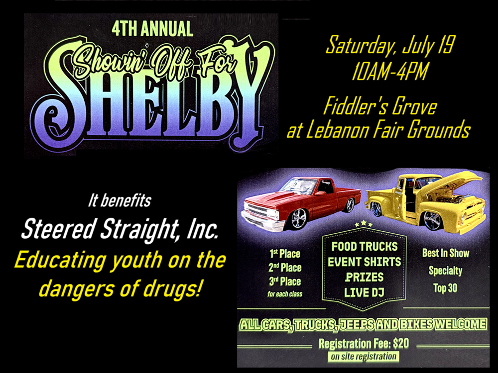 Sat. (July 19, 2025) 10AM-PM 4th Annual Showin' Off For Shelby cars trucks, jeeps and bikes on display! Registration fee is $20 and it helps the fight against addiction. Plus, ON-SITE REGISTRATION! This helps Steered Straight, Inc. that helps to educate youth on the dangers of drugs. Steered Straight's mission: To steer youth straight toward making sound, rational decisions through a learning experience that provides a message of reality to help them make positive, informed choices. There will be a 1sr, 2nd, and 3rd place award in each class; along with Best In Show, Specialty, and Top 30. There will be food trucks, event shirts, prizes and a live DJ.