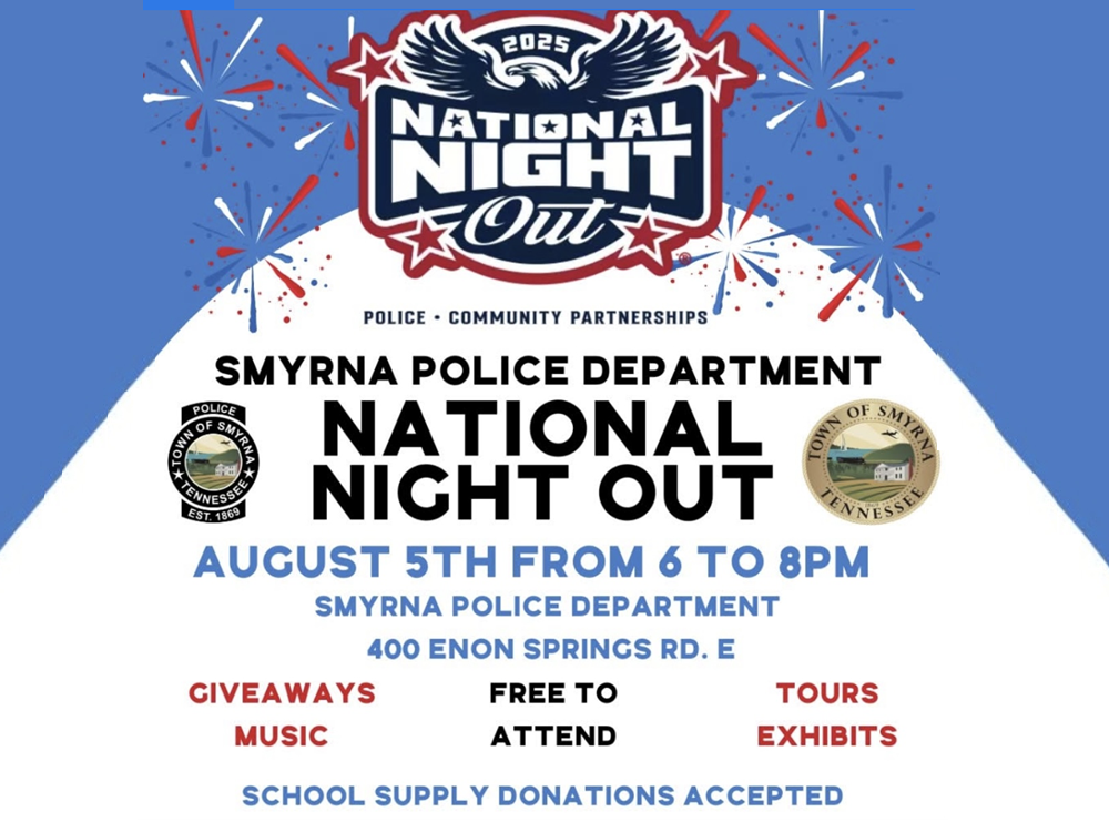 Tue. (Aug. 5, 2025) 6-8PM Town of Smyrna's NATIONAL NIGHT OUT at the Smyrna Police Department (400 Enon Springs Rd. E. Bring the family--it's FREE to attend. The night includes giveaways, music, tours and exhibits. Also, SCHOOL SUPPLY DONATIONS WILL BE ACCEPTED.