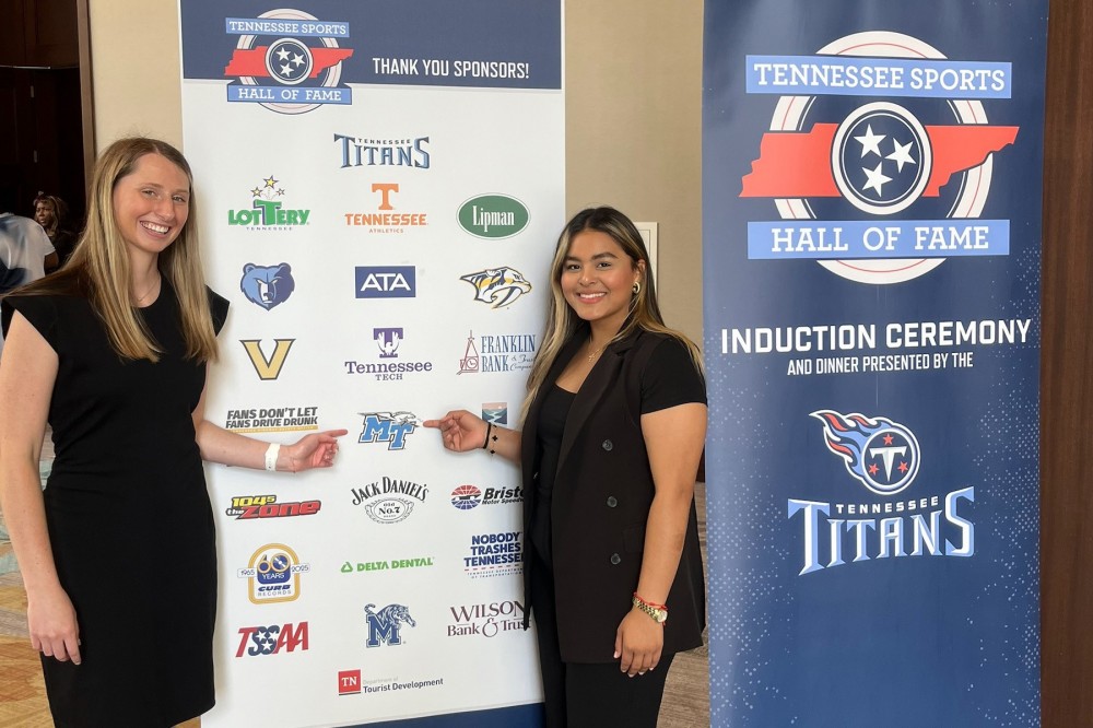 MURFREESBORO, Tenn. — Two Middle Tennessee State University seniors stepped into leadership roles as volunteers for the annual Tennessee Sports Hall of Fame induction ceremony and banquet held Saturday, July 19, at the Omni Hotel in downtown Nashville. Emily Chubb, a Tourism and Hospitality Management program major and Genesis Sanchez Maldonado, a Business Management major, represented MTSU as part of a cohort of college students from across the state who were chosen to help with the event that inducted 20 hall of famers for the Class of 2025.