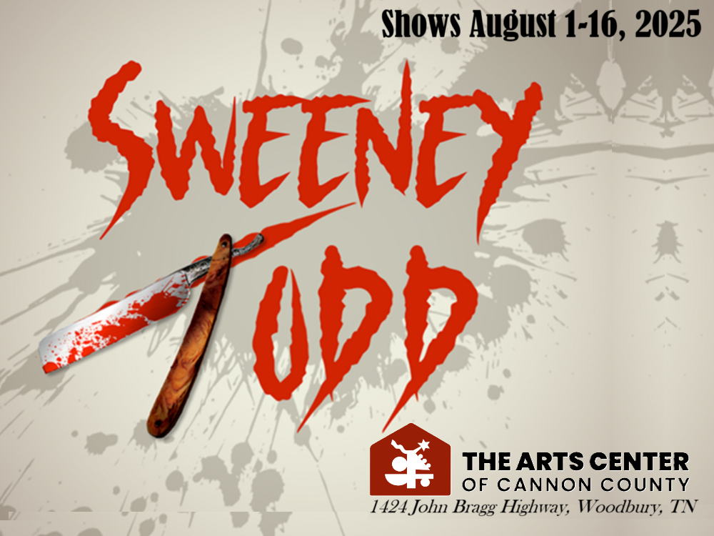 Fri-Sat 7:30PM / Sun 2:00PM (Aug. 1-16, 2025) The Arts Center of Cannon County, 1424 John Bragg Highway in neighboring Woodbury, TN, presents "Sweeney Todd". Sweeney Todd, an unjustly exiled barber, returns to nineteenth century London, seeking vengeance against the lecherous judge who framed him and ravaged his young wife. The road to revenge leads Todd to Mrs. Lovett, a resourceful proprietress of a failing pie shop, above which, he opens a new barber practice. Mrs. Lovett's luck sharply shifts when Todd's thirst for blood inspires the integration of an ingredient into her meat pies that has the people of London lining up... and the carnage has only just begun! This is rated PG-13. For more information or to reserve your tickets, phone 615-563-ARTS (2707).