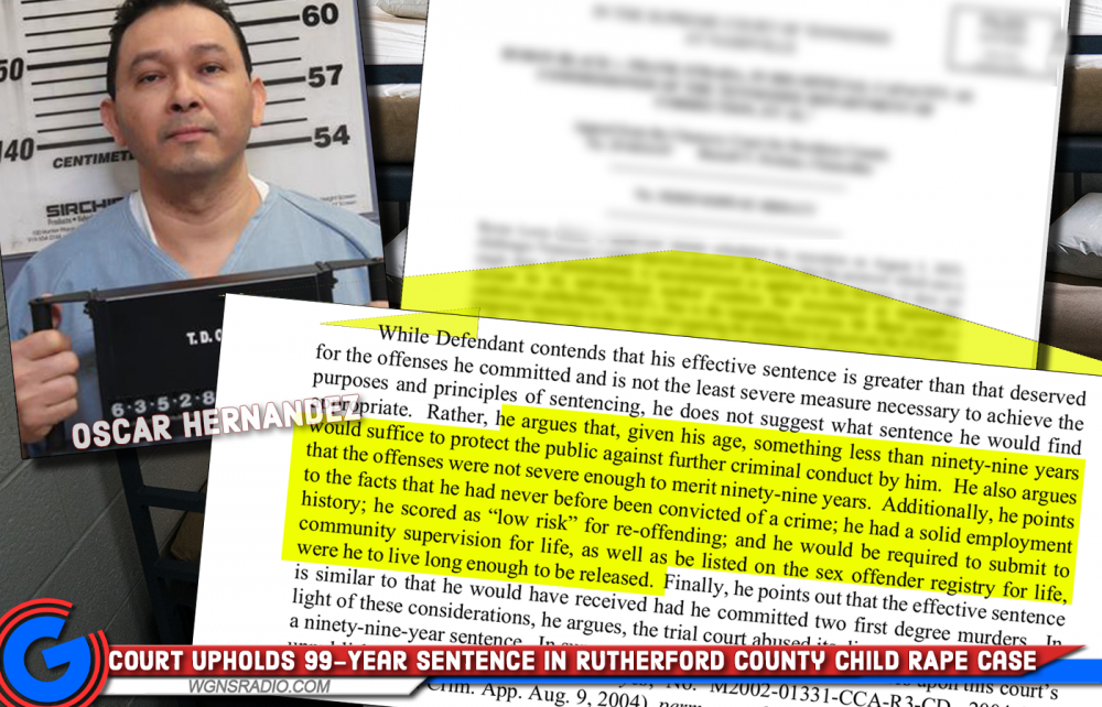 NASHVILLE, Tenn. — The Tennessee Court of Criminal Appeals has affirmed the 99-year sentence of Oscar Hernandez, who was convicted by a jury of three counts of rape of a child and five counts of aggravated sexual battery. The convictions stem from a pattern of abuse involving a minor victim, and the sentence reflects the severity and duration of the crimes.