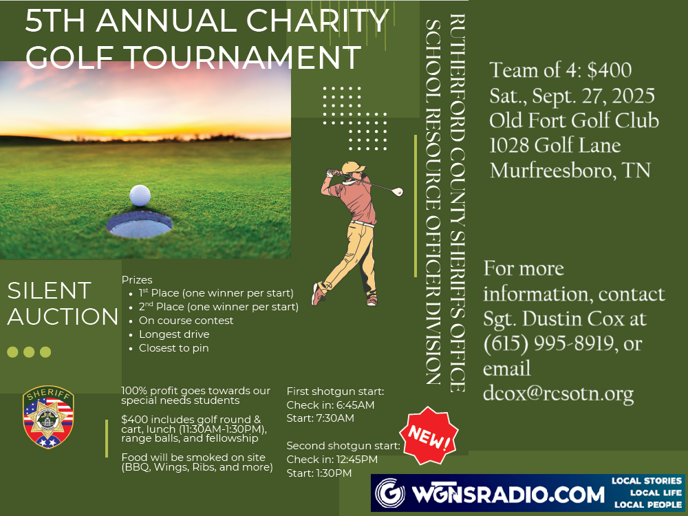 Prizes will be given in both the morning and afternoon competition for first and second place, an on course contest, longest drive and closest to the pin. Sponsorships are also being accepted. Contact Sgt. Dustin Cox, Rutherford County Sheriff’s Office, 940 New Salem Highway, Murfreesboro, TN 37129 with SRO in the memo line.