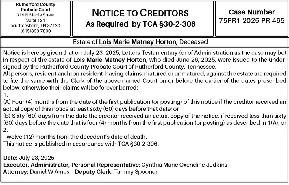 Notice is hereby given that on July 23, 2025, Letters Testamentary (or of Administration as the case may be) in respect of the estate of Lois Marie Matney Horton, who died June 26, 2025, were issued to the undersigned by the Rutherford County Probate Court of Rutherford County, Tennessee.