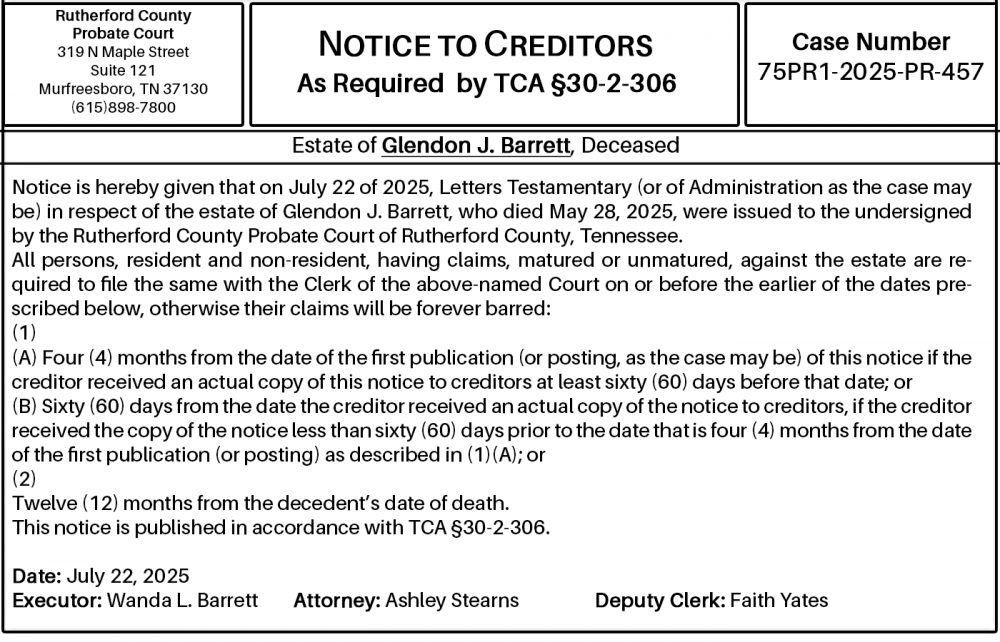 Notice is hereby given that on July 22 of 2025, Letters Testamentary (or of Administration as the case may be) in respect of the estate of Glendon J. Barrett, who died May 28, 2025, were issued to the undersigned by the Rutherford County Probate Court of Rutherford County, Tennessee.