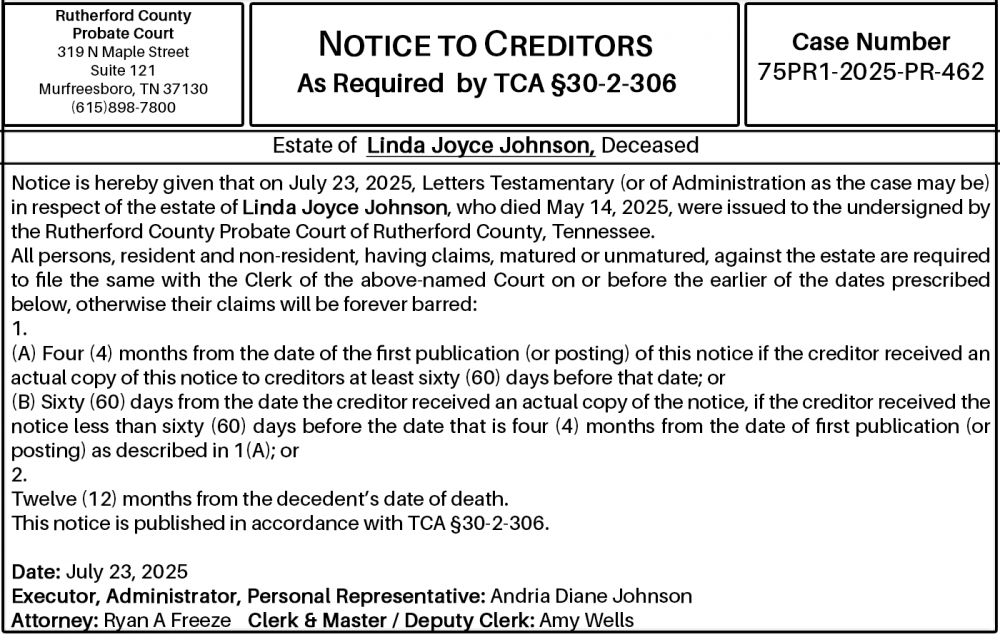 Notice is hereby given that on July 23, 2025, Letters Testamentary (or of Administration as the case may be) in respect of the estate of Linda Joyce Johnson, who died May 14, 2025, were issued to the undersigned by the Rutherford County Probate Court of Rutherford County, Tennessee.