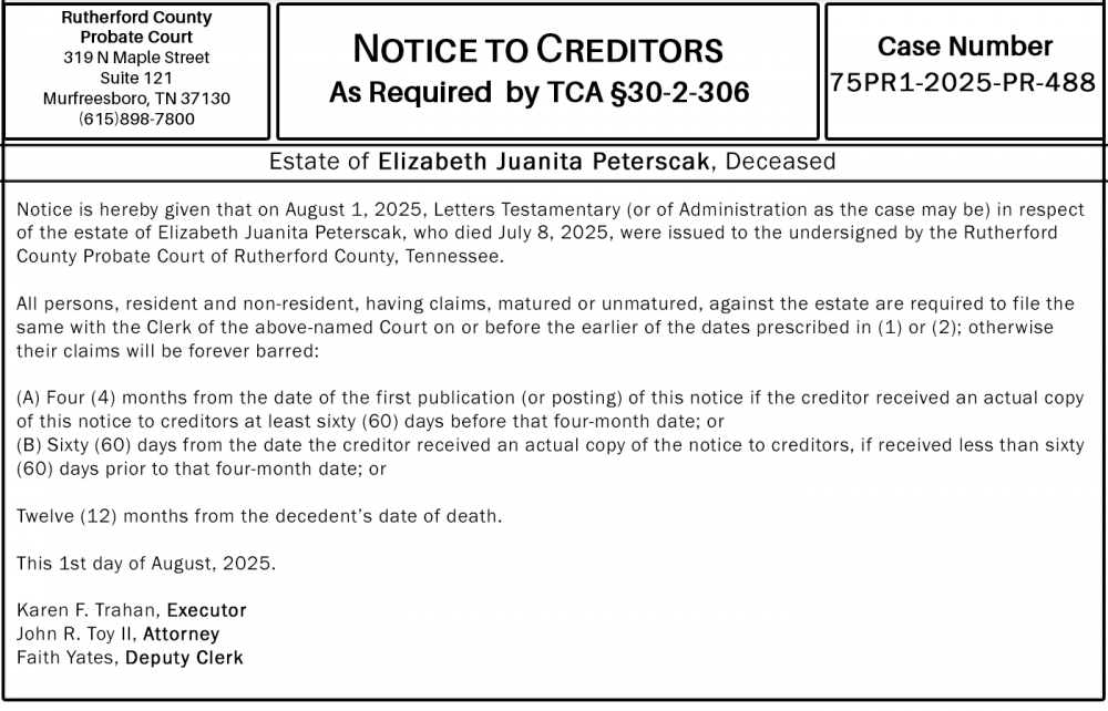 Notice is hereby given that on August 1, 2025, Letters Testamentary (or of Administration as the case may be) in respect of the estate of Elizabeth Juanita Peterscak, who died July 8, 2025, were issued to the undersigned by the Rutherford County Probate Court of Rutherford County, Tennessee.