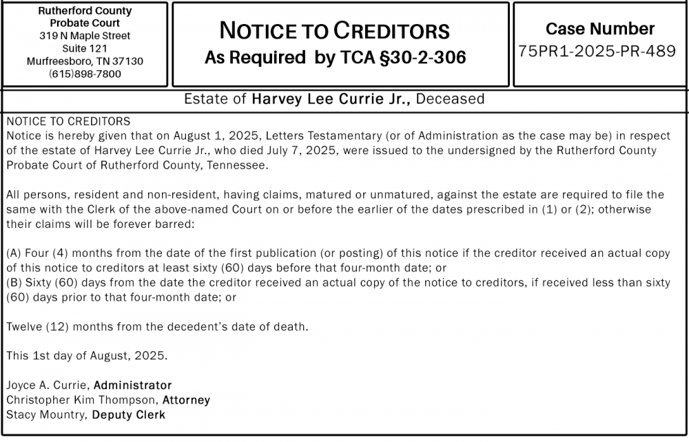 Notice is hereby given that on August 1, 2025, Letters Testamentary (or of Administration as the case may be) in respect of the estate of Harvey Lee Currie Jr., who died July 7, 2025, were issued to the undersigned by the Rutherford County Probate Court of Rutherford County, Tennessee.
