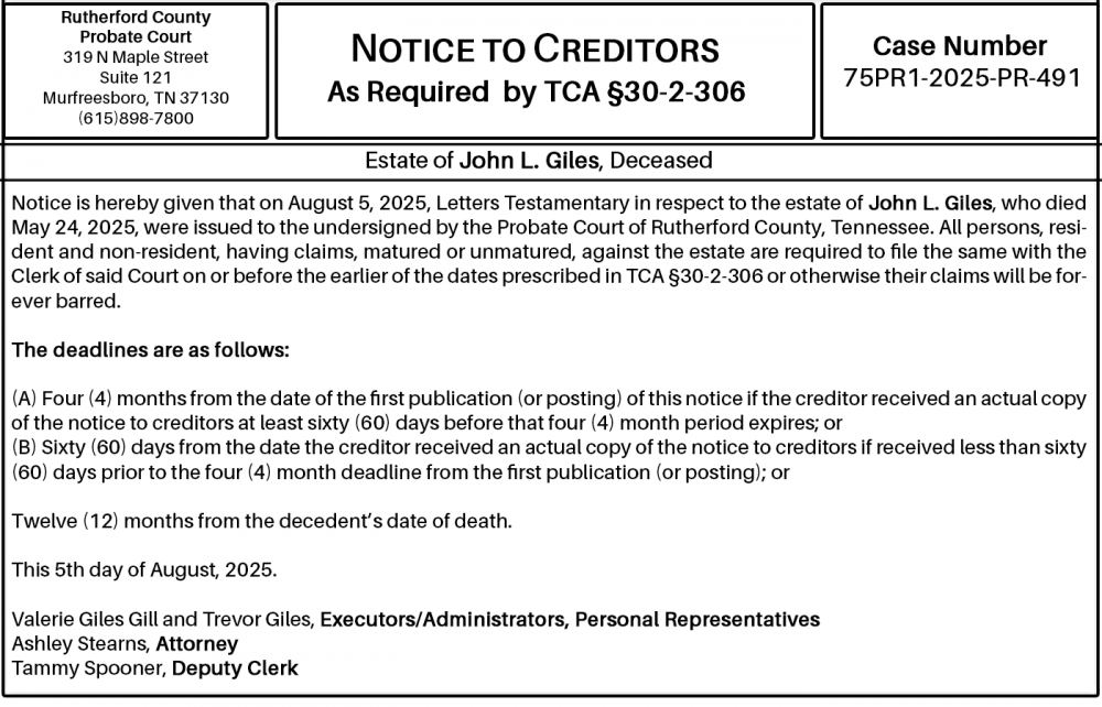 Notice is hereby given that on August 5, 2025, Letters Testamentary in respect to the estate of John L. Giles, who died May 24, 2025, were issued to the undersigned by the Probate Court of Rutherford County, Tennessee. All persons, resident and non-resident, having claims, matured or unmatured, against the estate are required to file the same with the Clerk of said Court on or before the earlier of the dates prescribed in TCA §30-2-306 or otherwise their claims will be forever barred.