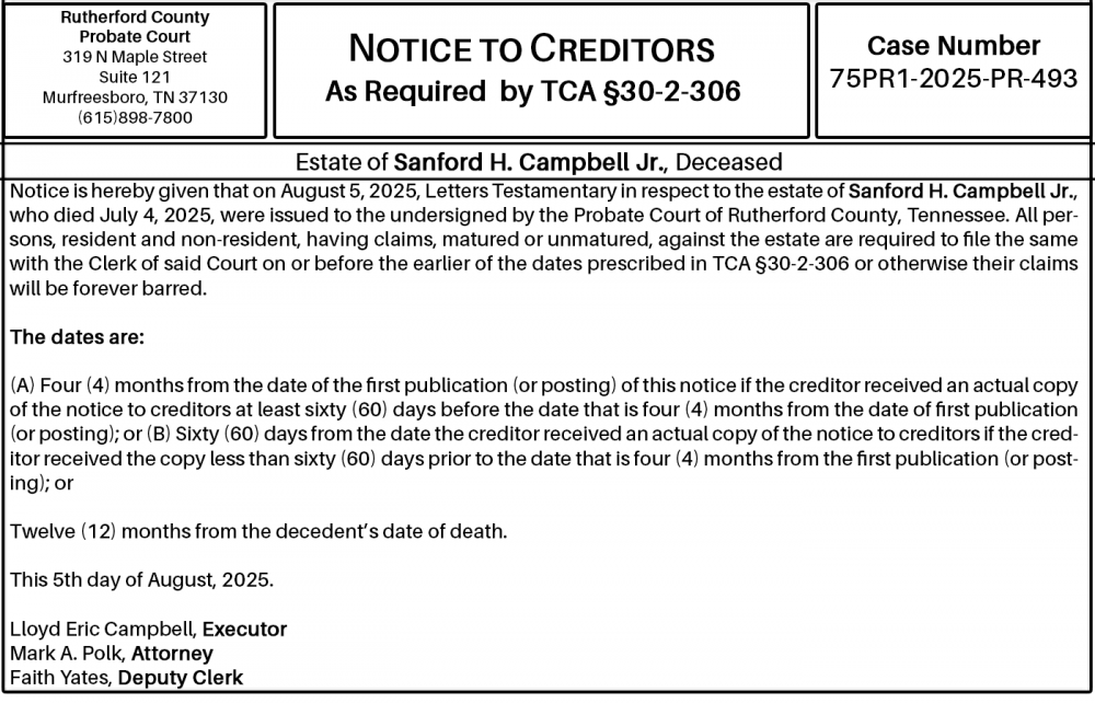 Notice is hereby given that on August 5, 2025, Letters Testamentary in respect to the estate of Sanford H. Campbell Jr., who died July 4, 2025, were issued to the undersigned by the Probate Court of Rutherford County, Tennessee. All persons, resident and non-resident, having claims, matured or unmatured, against the estate are required to file the same with the Clerk of said Court on or before the earlier of the dates prescribed in TCA §30-2-306 or otherwise their claims will be forever barred.