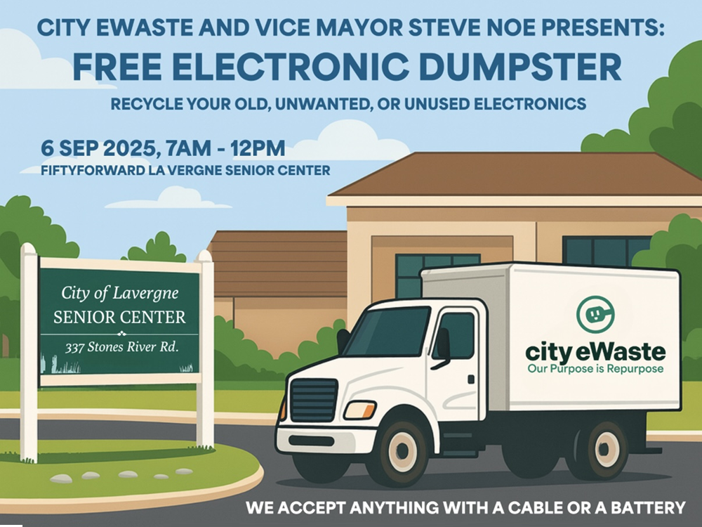 Sat. (Sept. 6, 2025) 7AM - Noon FREE Electronic Dumpster in La Vergne @ 50 Forward Senior Center (337 Stones River Road, La Vergne). Drop off electronics--ANYTHING with a cord or battery. Donations to help the La Vergne Sr. Center are also encouraged, but not required.