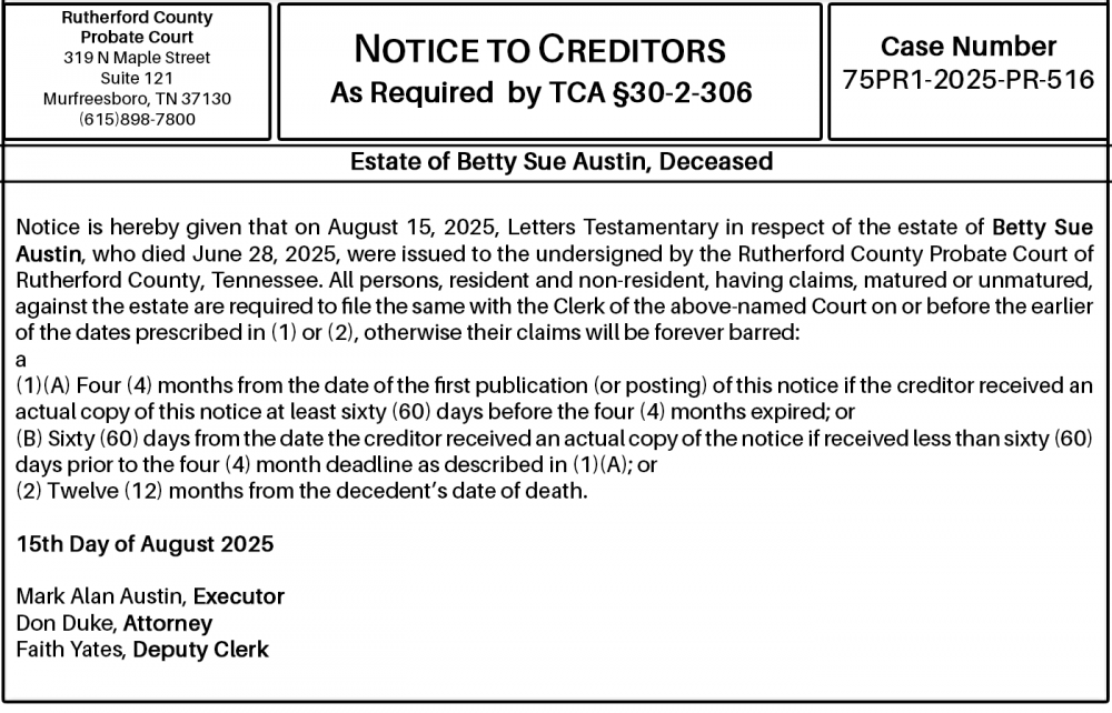 Notice is hereby given that on August 15, 2025, Letters Testamentary in respect of the estate of Betty Sue Austin, who died June 28, 2025, were issued to the undersigned by the Rutherford County Probate Court of Rutherford County, Tennessee. All persons, resident and non-resident, having claims, matured or unmatured, against the estate are required to file the same with the Clerk of the above-named Court on or before the earlier of the dates prescribed in (1) or (2), otherwise their claims will be forever barred: