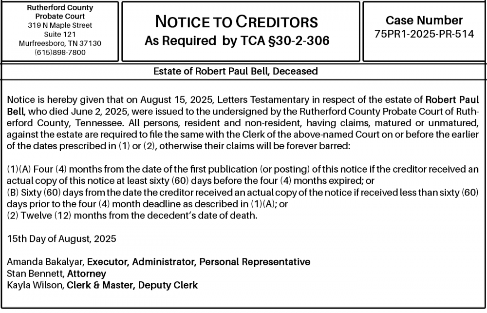 Notice is hereby given that on August 15, 2025, Letters Testamentary in respect of the estate of Robert Paul Bell, who died June 2, 2025, were issued to the undersigned by the Rutherford County Probate Court of Rutherford County, Tennessee. All persons, resident and non-resident, having claims, matured or unmatured, against the estate are required to file the same with the Clerk of the above-named Court on or before the earlier of the dates prescribed in (1) or (2), otherwise their claims will be forever barred:
