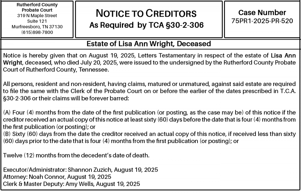 Notice is hereby given that on August 19, 2025, Letters Testamentary in respect of the estate of Lisa Ann Wright, deceased, who died July 20, 2025, were issued to the undersigned by the Rutherford County Probate Court of Rutherford County, Tennessee.