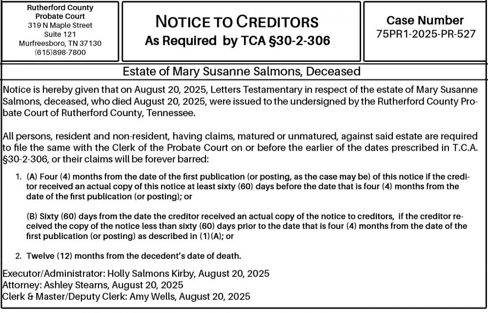 Notice is hereby given that on August 20, 2025, Letters Testamentary in respect of the estate of Mary Susanne Salmons, deceased, who died August 20, 2025, were issued to the undersigned by the Rutherford County Probate Court of Rutherford County, Tennessee.