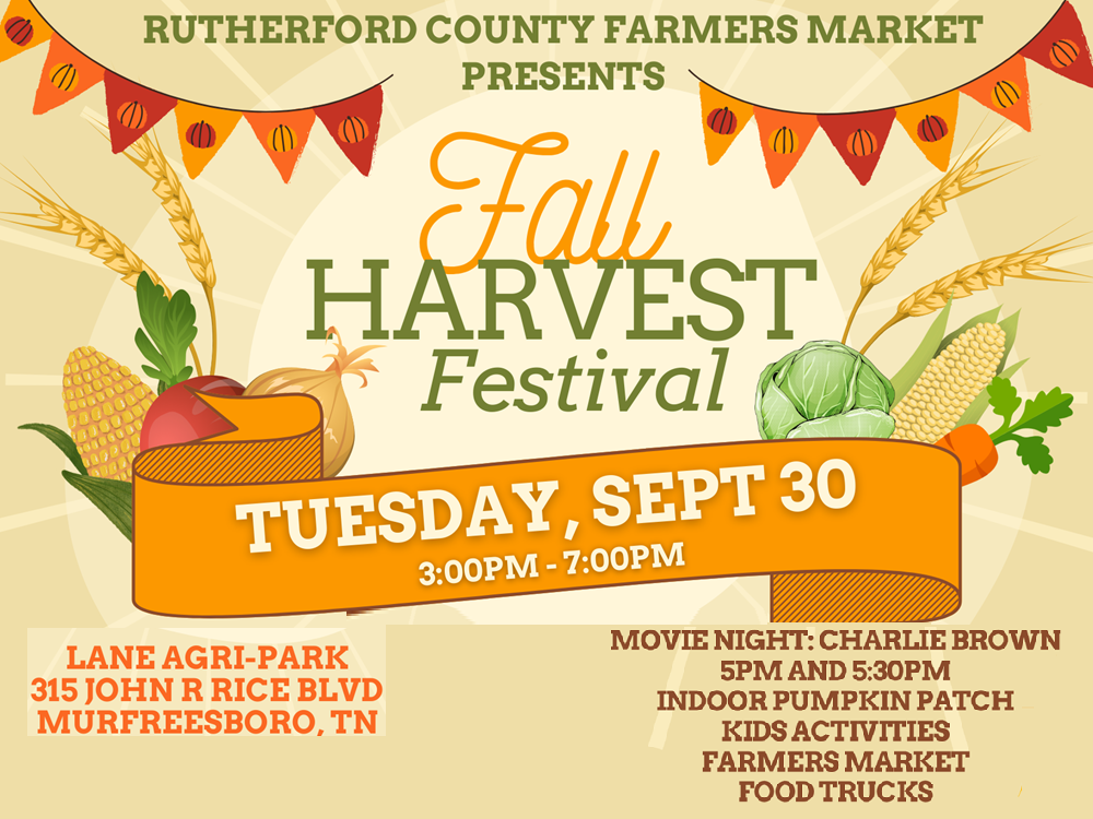 Tue. (Sept. 30, 2025) 3-7PM The Fall Harvest Festival in the Community Center at the Lane Agri-Park (315 John R. Rice Blvd.). It's presented by the Rutherford County Farmers Market and is a family-friendly celebration for all ages that's packed with autumn fun and community spirit.