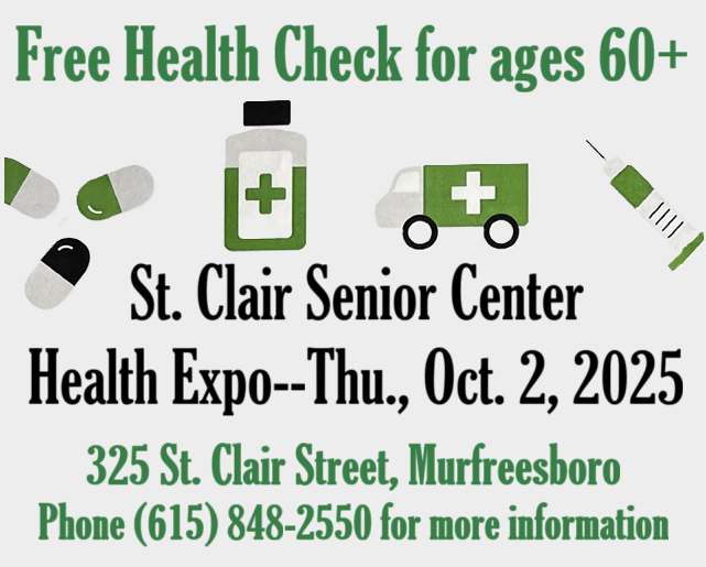 Thu. (Oct. 2, 2025) 8:00AM-Noon FREE HEALTH EXPO 2025 at the St. Clair Street Senior Center (325 St. Clair Street). Free healthcare information for persons age 60+--includes screenings and assessments. Plus, snacks, giveaways and door prizes! It's all FREE! WHAT TO EXPECT: Health checks and assessments including hearing and vision tests, flu shots, nutrition info, depression screening, foot assessment, brain health, sleep check-up, skin check-up and more. For more information, phone Laura Grissom the St. Clair Street Senior Center at 615-848-2550. If you prefer, email her at lgrissom@murfreesborotn.gov.
