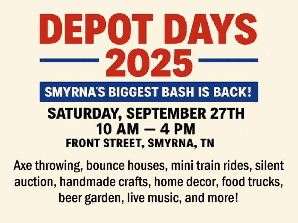 Sat (Sept. 27, 2025) 10AM-4PM The Annual Depot Days in Smyrna's Historic Depot District. Over 100 vendors, ax throwing, bounce houses, live music, and packed with fun for all ages. It is presented by the Smyrna Parks & Recreation Department.