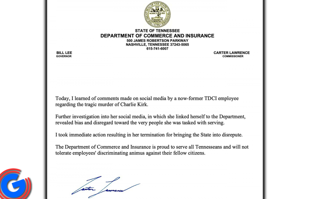 NASHVILLE, Tenn. – Tennessee Department of Commerce & Insurance (TDCI) Commissioner Carter Lawrence announced Friday that a department employee was terminated following comments made on social media regarding the murder of conservative activist Charlie Kirk.