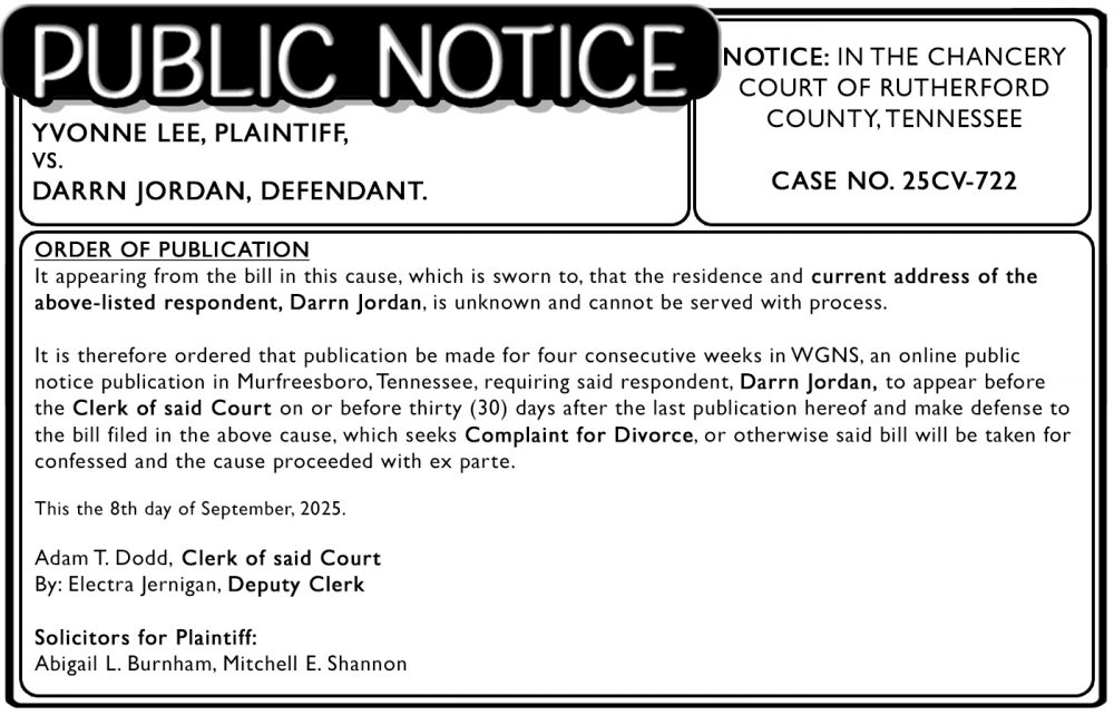 It is therefore ordered that publication be made for four consecutive weeks in WGNS, an online public notice publication in Murfreesboro, Tennessee, requiring said respondent, Darrn Jordan, to appear before the Clerk of said Court on or before thirty (30) days after the last publication hereof and make defense to the bill filed in the above cause, which seeks Complaint for Divorce, or otherwise said bill will be taken for confessed and the cause proceeded with ex parte.