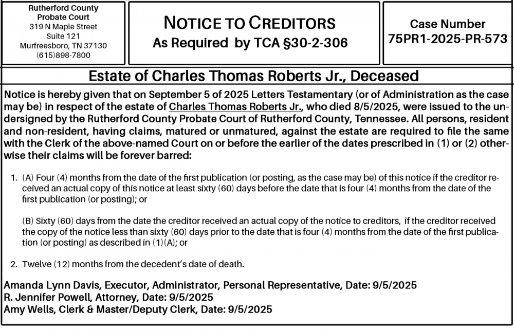 Notice is hereby given that on September 5 of 2025 Letters Testamentary (or of Administration as the case may be) in respect of the estate of Charles Thomas Roberts Jr., who died 8/5/2025, were issued to the undersigned by the Rutherford County Probate Court of Rutherford County, Tennessee. All persons, resident and non-resident, having claims, matured or unmatured, against the estate are required to file the same with the Clerk of the above-named Court on or before the earlier of the dates prescribed in (1) or (2) otherwise their claims will be forever barred: