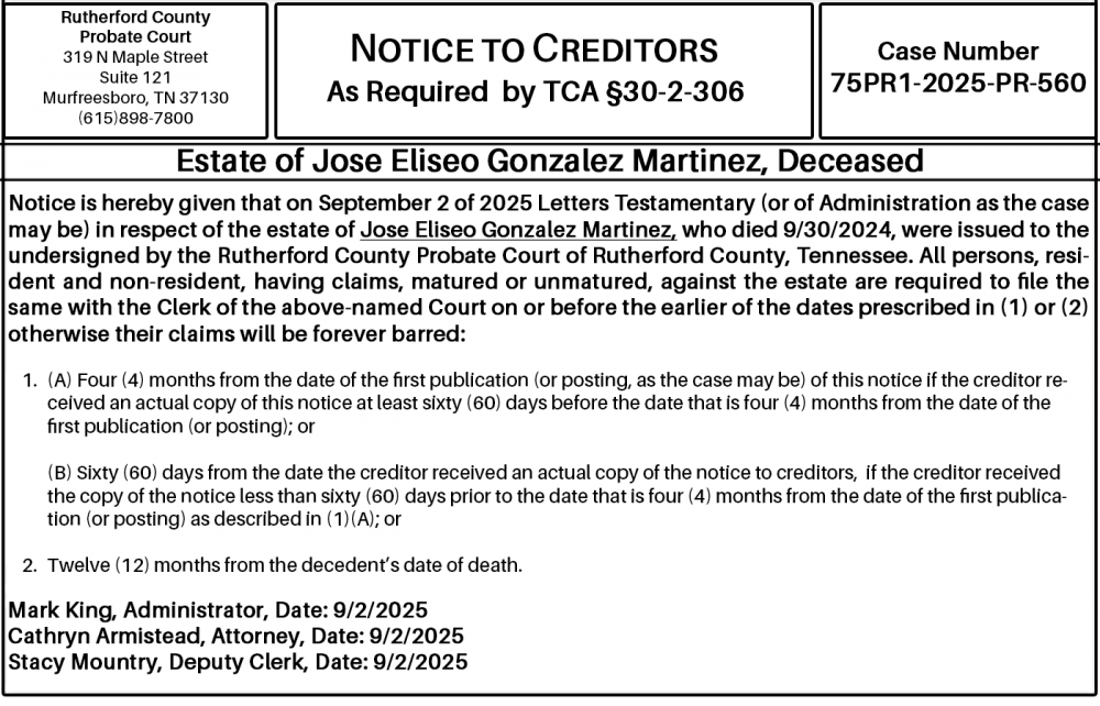 Notice is hereby given that on September 2 of 2025 Letters Testamentary (or of Administration as the case may be) in respect of the estate of Jose Eliseo Gonzalez Martinez, who died 9/30/2024, were issued to the undersigned by the Rutherford County Probate Court of Rutherford County, Tennessee. All persons, resident and non-resident, having claims, matured or unmatured, against the estate are required to file the same with the Clerk of the above-named Court on or before the earlier of the dates prescribed in (1) or (2) otherwise their claims will be forever barred: