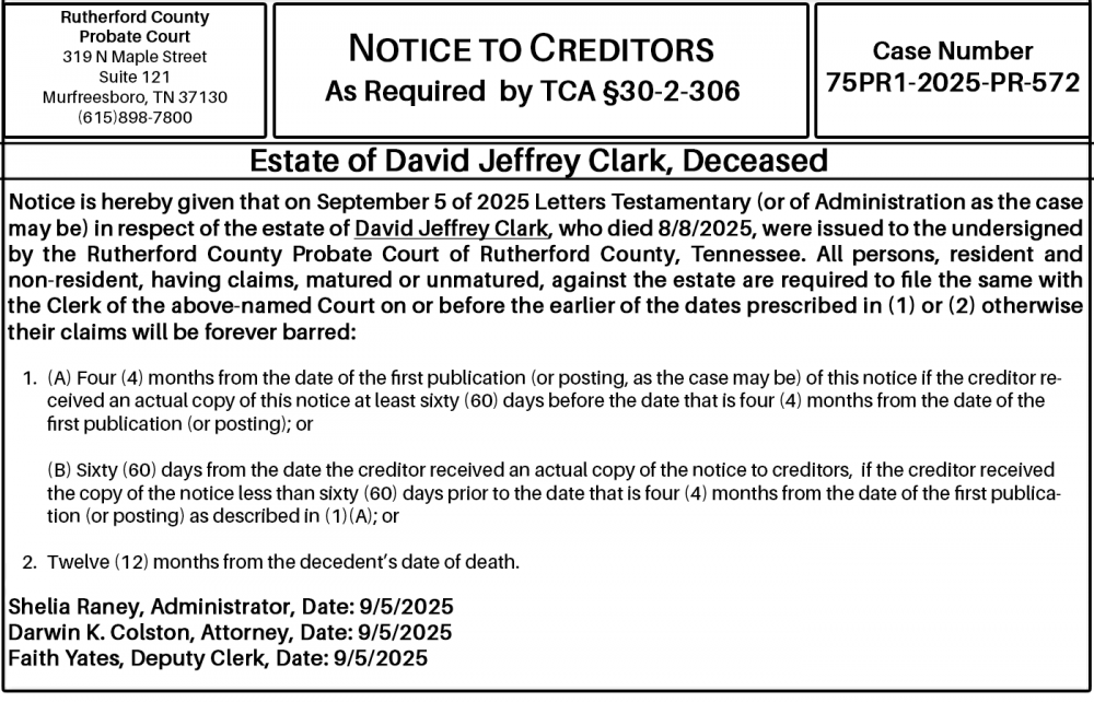 Notice is hereby given that on September 5 of 2025 Letters Testamentary (or of Administration as the case may be) in respect of the estate of David Jeffrey Clark, who died 8/8/2025, were issued to the undersigned by the Rutherford County Probate Court of Rutherford County, Tennessee. All persons, resident and non-resident, having claims, matured or unmatured, against the estate are required to file the same with the Clerk of the above-named Court on or before the earlier of the dates prescribed in (1) or (2) otherwise their claims will be forever barred: