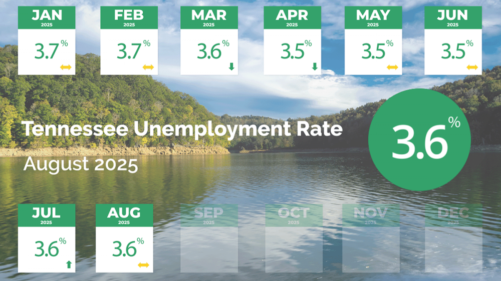 TENNESSEE – Tennessee’s unemployment rate remained unchanged in August at 3.6%, according to new data from the Tennessee Department of Labor and Workforce Development (TDLWD). The figure is seven-tenths of a percentage point below the national rate of 4.3%, continuing the state’s trend of outperforming the broader U.S. labor market.