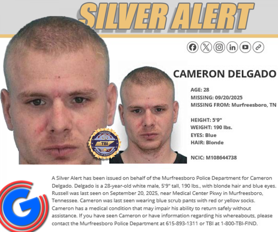 MURFREESBORO, Tenn. – The Tennessee Bureau of Investigation (TBI) has issued a Tennessee Silver Alert for a missing Murfreesboro man. Authorities are asking for the public’s help in locating 28-year-old Cameron Delgado, who was last seen on Saturday near Medical Center Parkway.