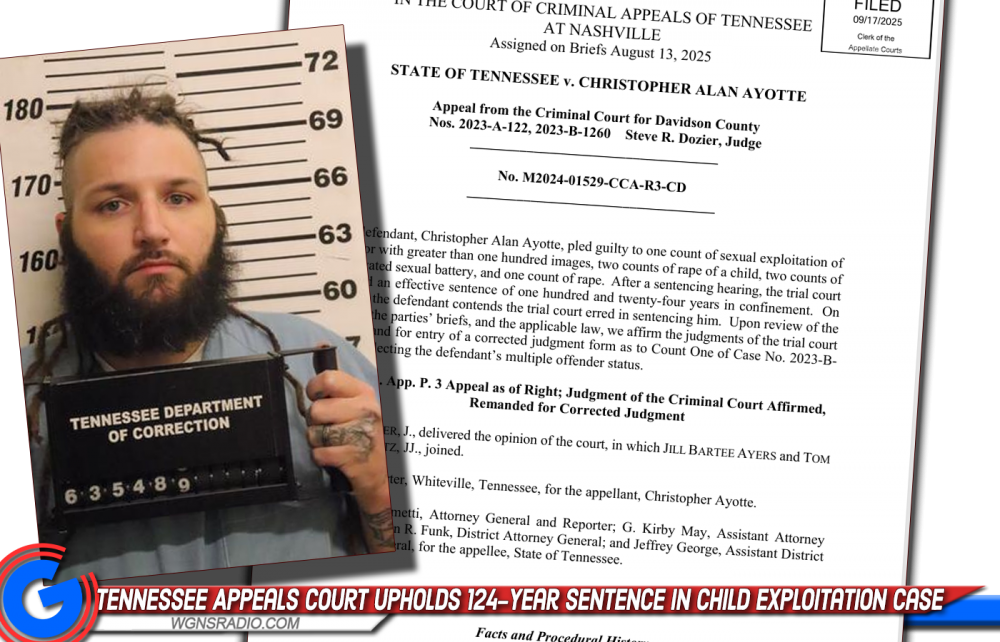 NASHVILLE, Tenn. – The Tennessee Court of Criminal Appeals has upheld the conviction and 124-year prison sentence of Christopher Alan Ayotte, a Davidson County man who pled guilty to multiple child sex crimes, including rape of a child, aggravated sexual battery, and sexual exploitation of a minor.