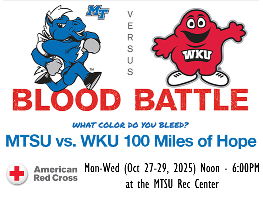 Mon-Wed (Oct. 27-29, 2025) Noon to 6PM MTSU Red Cross Blood Drive "BLEED BLUE, BEAT WKU" at the MTSU Rec Center. To schedule your appointment log into redcrossblood.org and enter sponsor code: MTSU; or phone 1-800 RED CROSS. Participants receive custom designed T-shirt and $10 eGift card; plus chance for 1 of 3 $5000 gift cards, plus free pizza and football tickets to MTSU home game.