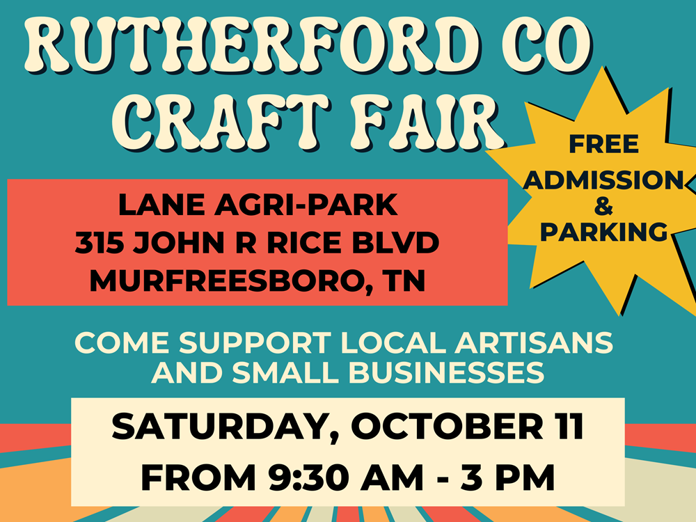 Murfreesboro, TN - The Rutherford County Craft Fair is making its much-anticipated return to the Lane Agri-Park on Saturday, Oct. 11, 2025 from 9:30AM to 3:00PM. Admission is free and so is the parking. It will be in the same building as the Farmer's Market, but on the opposite side of the 315 John R. Rice Blvd. structure.