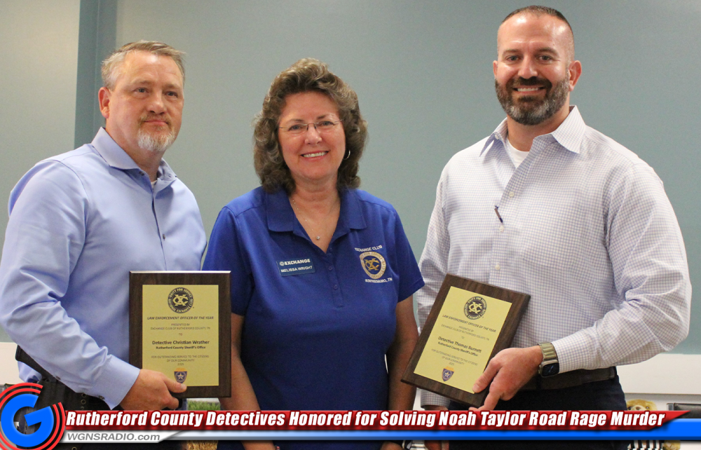 Rutherford County, TN - Rutherford County Sheriff’s Detective Thomas Burnett and Detective Christian Wrather were honored as recipients of the Law Enforcement Officer of the Year award from the Exchange Club of Rutherford County Wednesday. Burnett and Wrather were recognized as the lead detectives in solving the murder of Noah Taylor, 22, of Smyrna. Taylor was killed in a road rage shooting July 12 near the Waldron Road exit on Interstate 24.
