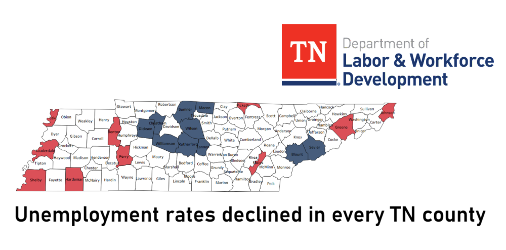 Nashville, TN - Unemployment rates declined in every Tennessee county in August 2025, according to new data from the Tennessee Department of Labor and Workforce Development (TDLWD). Ninety counties reported unemployment rates of less than 5% in August. The other five counties had rates of 5% or greater, with the highest at 5.4%.