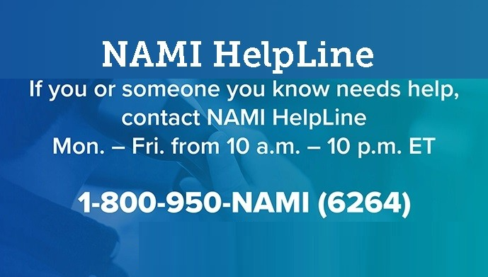2nd Thursday (monthly) 7-9PM NAMI (National Alliance on Mental Illness) meets at St. Paul’s Episcopal Church, 116 North Academy St., Murfreesboro, TN (enter on the College St. handicap entrance ramp). This is a “family to family” meeting. The NAMI Help Line is available 10AM-10PM Eastern Time Monday-Friday: 1-800-950-NAMI (6264).