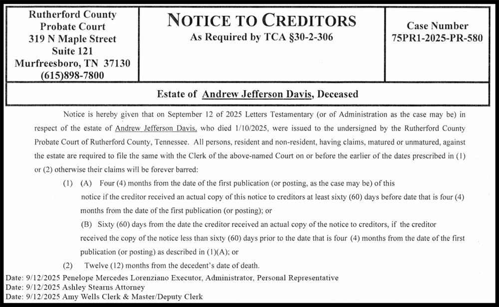Notice is hereby given that on September 12 of 2025 Letters Testamentary (or of Administration as the case may be) in respect of the estate of Andrew Jefferson Davis, who died 1/10/2025, were issued to the undersigned by the Rutherford County Probate Court of Rutherford County, Tennessee. All persons, resident and non-resident, having claims, matured or unmatured, against the estate are required to file the same with the Clerk of the above-named Court on or before the earlier of the dates prescribed in (1) or (2) otherwise their claims will be forever barred: