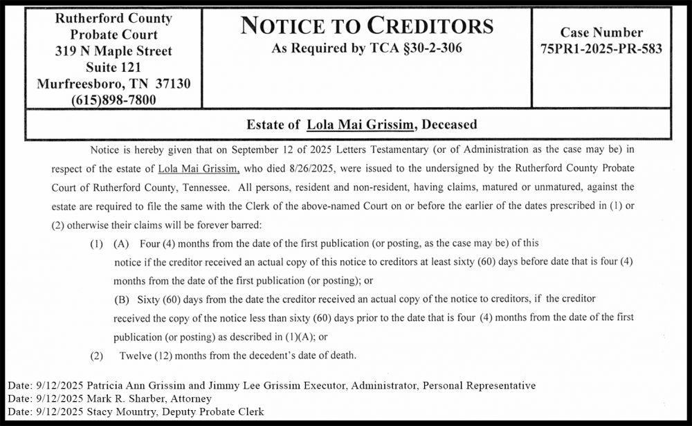 Notice is hereby given that on September 12 of 2025 Letters Testamentary (or of Administration as the case may be) in respect of the estate of Lola Mai Grissim, who died 8/26/2025, were issued to the undersigned by the Rutherford County Probate Court of Rutherford County, Tennessee. All persons, resident and non-resident, having claims, matured or unmatured, against the estate are required to file the same with the Clerk of the above-named Court on or before the earlier of the dates prescribed in (1) or (2) otherwise their claims will be forever barred: