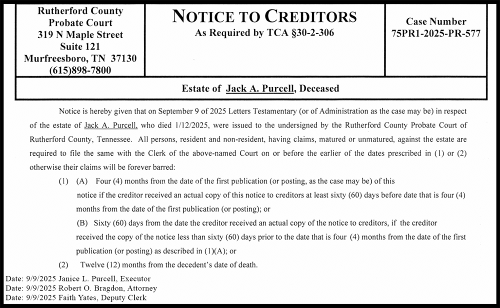 Notice is hereby given that on September 9 of 2025 Letters Testamentary (or of Administration as the case may be) in respect of the estate of Jack A. Purcell, who died 1/12/2025, were issued to the undersigned by the Rutherford County Probate Court of Rutherford County, Tennessee. All persons, resident and non-resident, having claims, matured or unmatured, against the estate are required to file the same with the Clerk of the above-named Court on or before the earlier of the dates prescribed in (1) or (2) otherwise their claims will be forever barred: