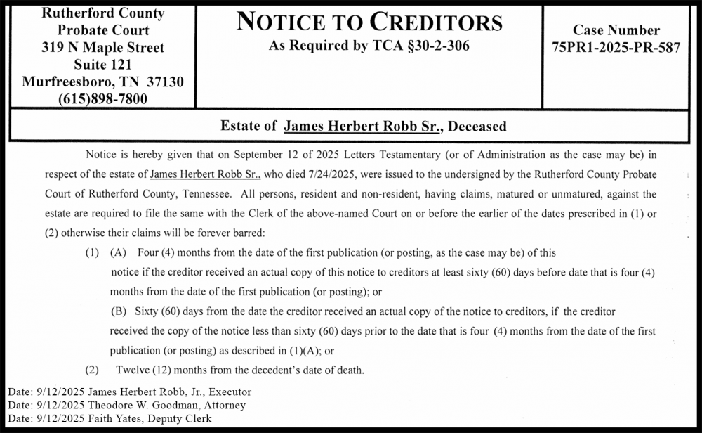 Notice is hereby given that on September 12 of 2025 Letters Testamentary (or of Administration as the case may be) in respect of the estate of James Herbert Robb Sr., who died 7/24/2025, were issued to the undersigned by the Rutherford County Probate Court of Rutherford County, Tennessee. All persons, resident and non-resident, having claims, matured or unmatured, against the estate are required to file the same with the Clerk of the above-named Court on or before the earlier of the dates prescribed in (1) or (2) otherwise their claims will be forever barred:
