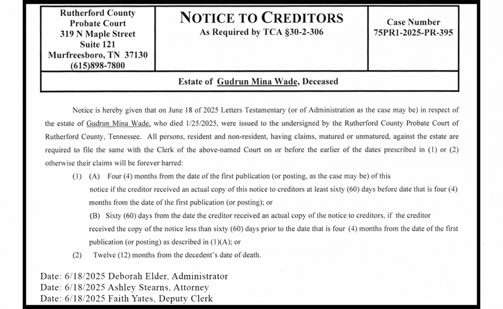 Notice is hereby given that on June 18 of 2025 Letters Testamentary (or of Administration as the case may be) in respect of the estate of Gudrun Mina Wade, who died 1/25/2025, were issued to the undersigned by the Rutherford County Probate Court of Rutherford County, Tennessee. All persons, resident and non-resident, having claims, matured or unmatured, against the estate are required to file the same with the Clerk of the above-named Court on or before the earlier of the dates prescribed in (1) or (2) otherwise their claims will be forever barred: