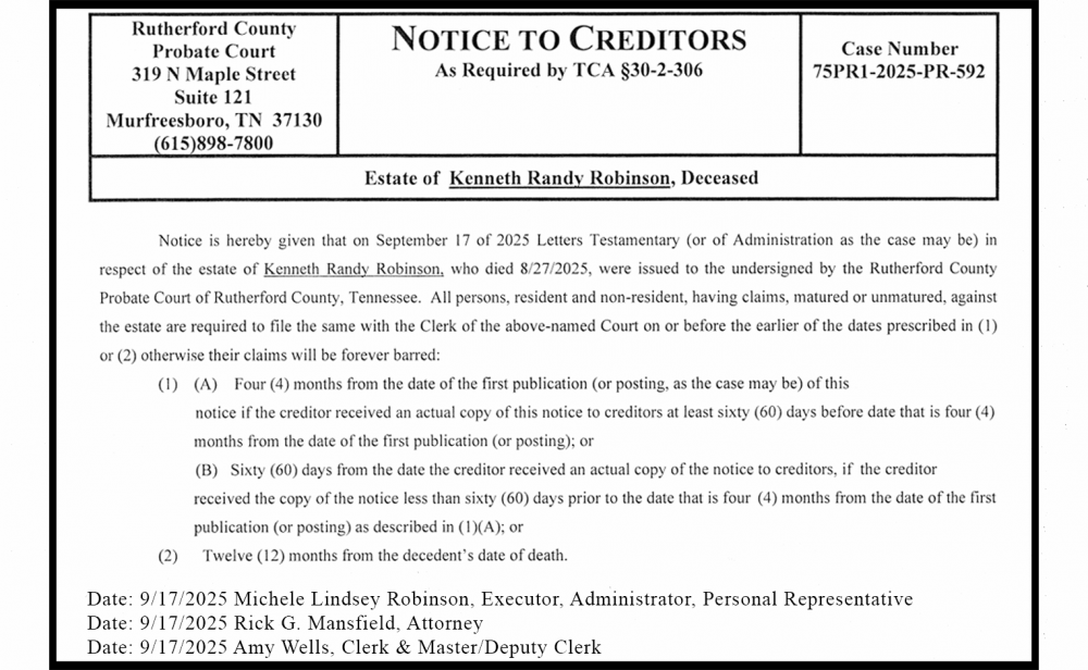 Notice is hereby given that on September 17 of 2025 Letters Testamentary (or of Administration as the case may be) in respect of the estate of Kenneth Randy Robinson, who died 8/27/2025, were issued to the undersigned by the Rutherford County Probate Court of Rutherford County, Tennessee. All persons, resident and non-resident, having claims, matured or unmatured, against the estate are required to file the same with the Clerk of the above-named Court on or before the earlier of the dates prescribed in (1) or (2) otherwise their claims will be forever barred: