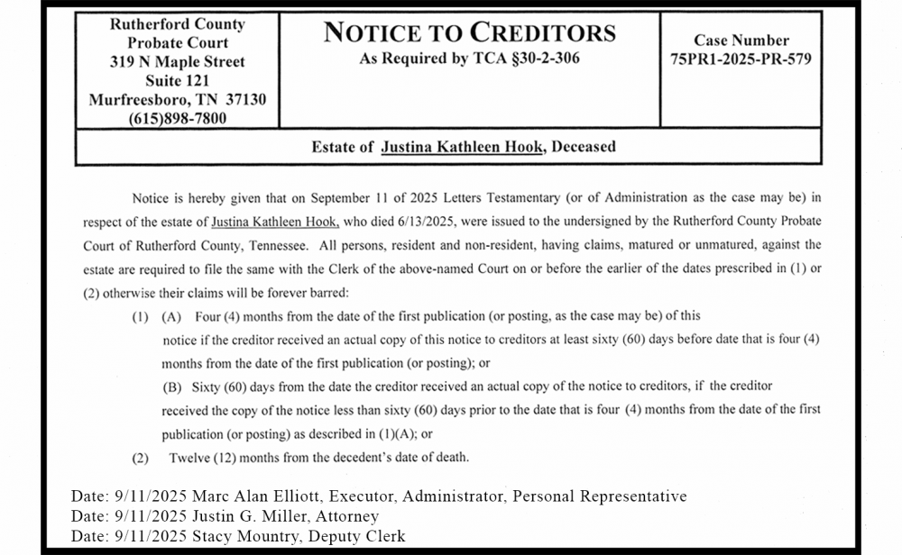 Notice is hereby given that on September 11 of 2025 Letters Testamentary (or of Administration as the case may be) in respect of the estate of Justina Kathleen Hook, who died 6/13/2025, were issued to the undersigned by the Rutherford County Probate Court of Rutherford County, Tennessee. All persons, resident and non-resident, having claims, matured or unmatured, against the estate are required to file the same with the Clerk of the above-named Court on or before the earlier of the dates prescribed in (1) or (2) otherwise their claims will be forever barred: