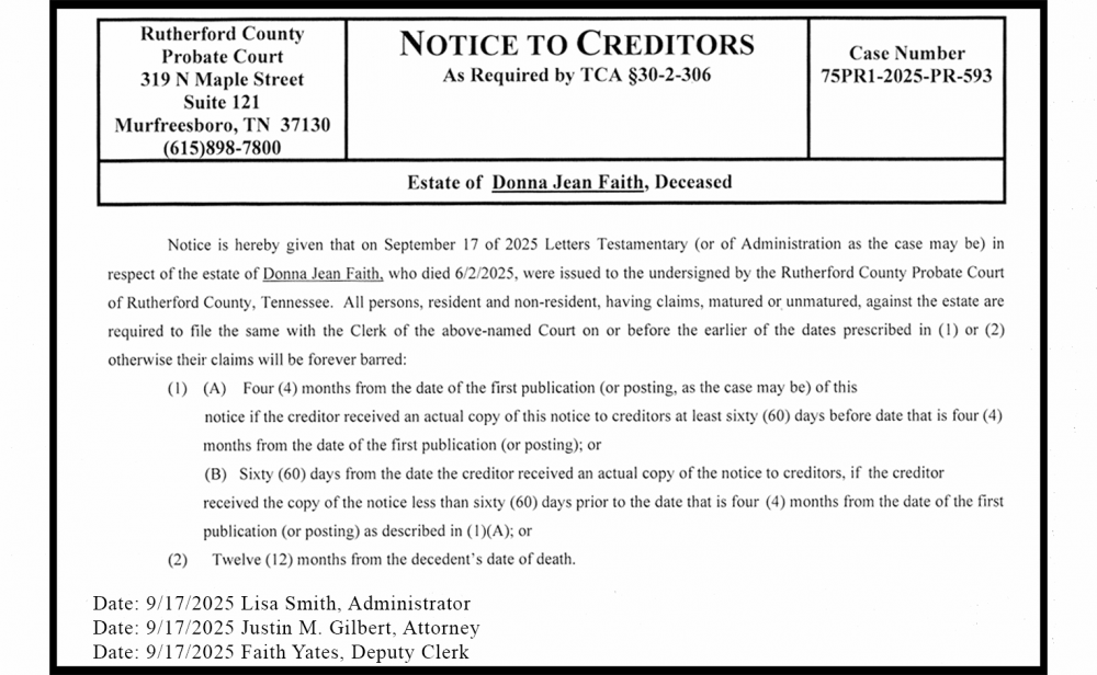 Notice is hereby given that on September 17 of 2025 Letters Testamentary (or of Administration as the case may be) in respect of the estate of Donna Jean Faith, who died 6/2/2025, were issued to the undersigned by the Rutherford County Probate Court of Rutherford County, Tennessee. All persons, resident and non-resident, having claims, matured or unmatured, against the estate are required to file the same with the Clerk of the above-named Court on or before the earlier of the dates prescribed in (1) or (2) otherwise their claims will be forever barred: